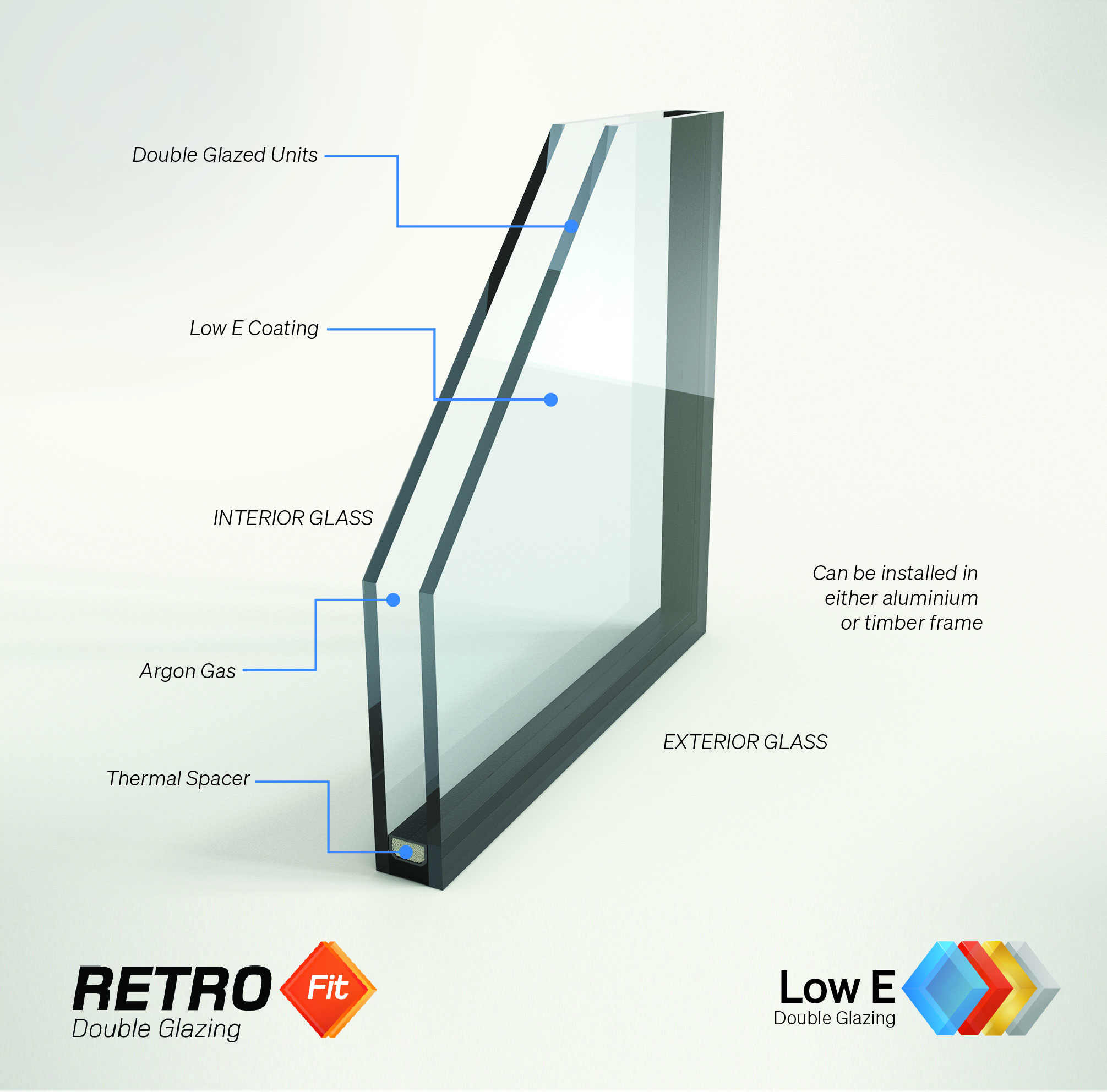 Low E (low emissivity) glass has a special invisible coating that helps reflect heat back into your home in winter and reduce excess solar heat in summer when paired with double glazing.